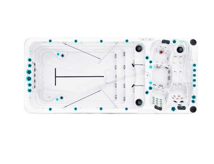 The Spirit is divided into separate swim and spa sections, and you can vary the temperature between the two. This configuration allows you to enjoy a cool, comfortable workout followed by a warm, soothing soak.
